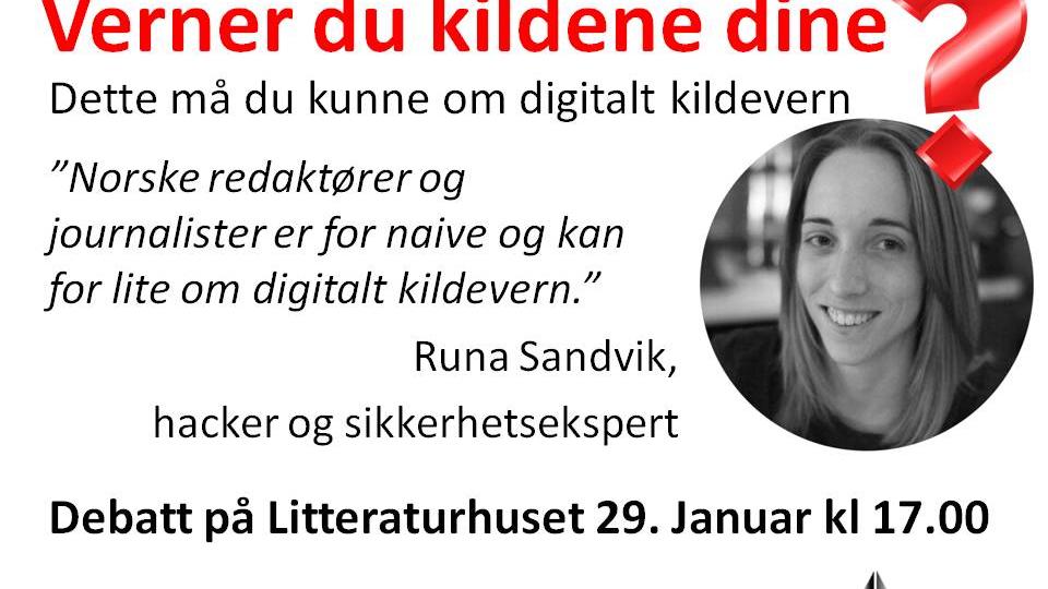 Kan du nok om hvordan du sikrer kildene dine ved elektronisk kommunikasjon? Nei, mener sikkerhetsekspert og hacker Runa Sandvik. Lær av henne og flere flinke folk på Litteraturhuset i Oslo torsdag 29 …